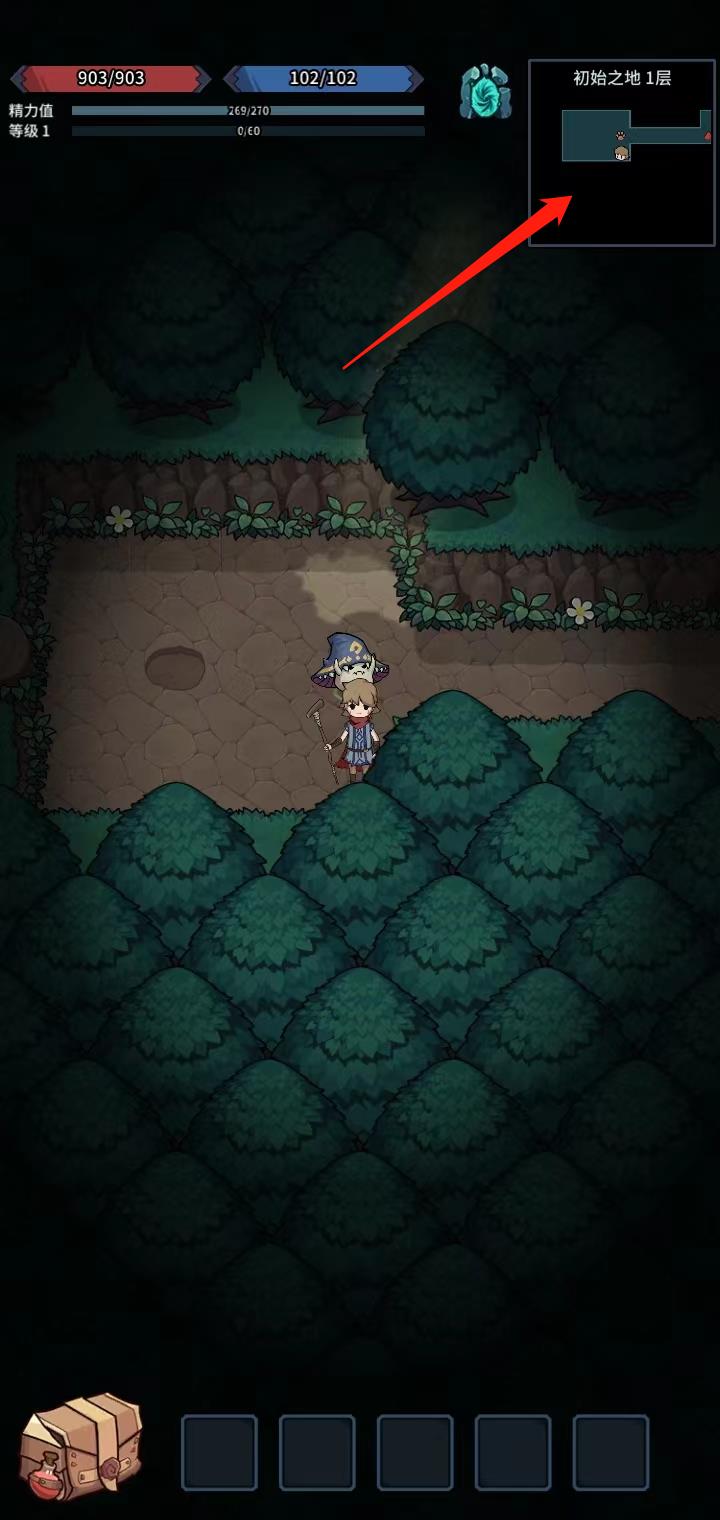 5、接下来玩家就可以开启冒险之旅了;在右上角可以查看自己所处的位置以及怪物所在的位置(红色三角形);