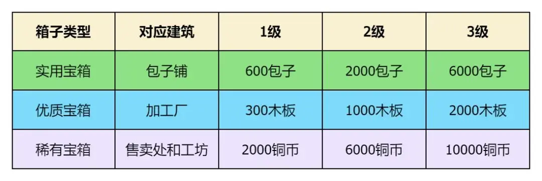 4、绿/蓝/紫箱子的资源与建筑等级挂钩。飞升进入大世界后,应优先将系统等级提升至13级以解锁中级建造术,再将包子铺、加工厂、售卖处/工坊等建筑拉满,确保优质宝箱收益最大化。
