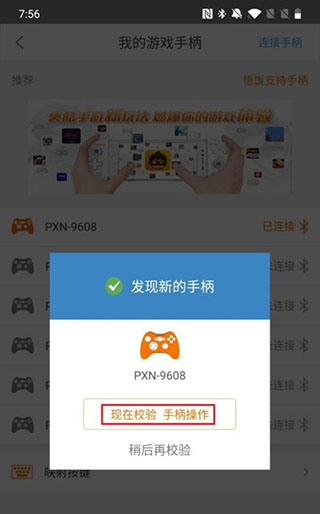 返回会自动回到悟饭游戏厅,再发现新的手柄,说明已经连接成功。游戏厅已经识别上手柄,点击“现在校验 手柄操作”,进入测试界面测试手柄。