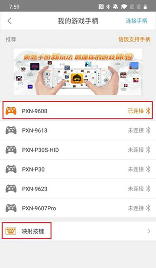在我的游戏手柄界面,显示已连接的手柄型号“PXN-9608”,接下来设置手柄键位,点击下方的映射按键。