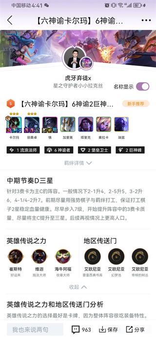 3、进入后即可查看该阵容的具体内容,如阵容组成英雄、装备、适配的英雄传说之力、地区传送门、如何运营等等阵容相关攻略