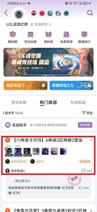 2、即可查看云顶的热门阵容,任选一个阵容点击,如六神谕卡尔玛