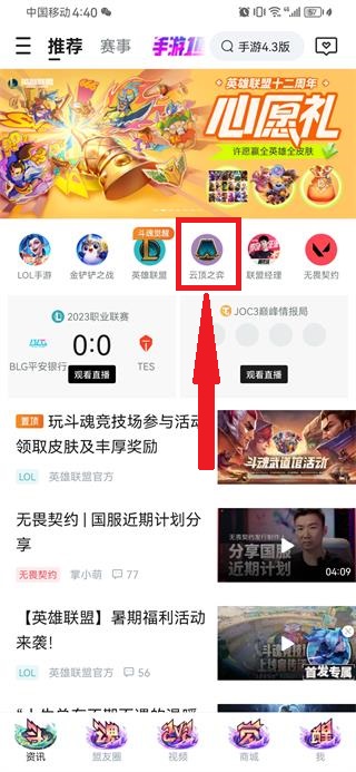 1、进入“资讯”板块,可以搜索云顶之弈,也可以点击如图所示云顶板块