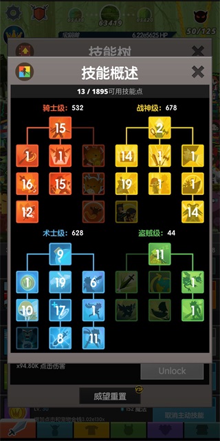 这次的技能树真是厉害了,在游戏中你会获得技能点,有三个技能树你可以选择从哪个开始加,每个都好想要啊,不过技能点不是那么好得到的,除此之外还可以获得武器,武器可以升级,如果收集了全套的武器套组还能变得更强,当然,武器和之前说的装备都不是那么好得到的,由此可见,放置游戏都一样,只有玩的时间长才能当上老大,时间越久你就越厉害。