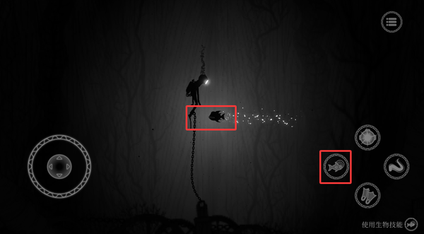 5、当你通过触手能力控制住小型鱼儿后,让它游到主角脚边,利用其“撕咬”来咬断铁链,从而开启新的通路。