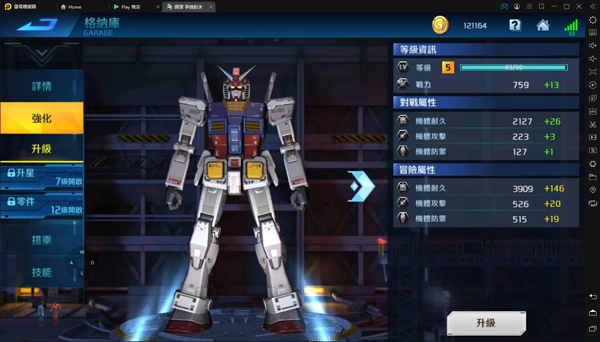 强化需要消耗作战纪录晶片和金币,根据指挥官等级机体就只能升至对应等级。升星需要7等开启系统,材料是机体碎片和金币,达到3星和5星可以解锁各一个胜利动作。如果重复获得机体系统会自动转化成碎片,以便于可以进行升星。