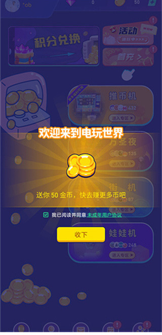 3、在首页页面中,玩家能够看到推币机、万圣夜、街机、娃娃机等多种玩法。