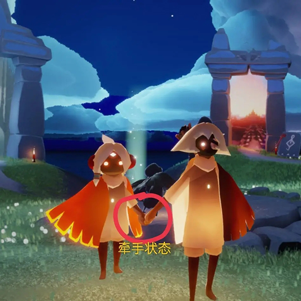求助状态下,陌生人视角你的头上有牵手图标,陌生的路人点击图标,能够直接从地面上把你牵起来,带你飞和跑;