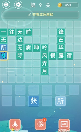 第9关答案:一往无前、无边无际、无病呻吟、风餐露宿、锋芒毕露、吟风弄月、一无所获。