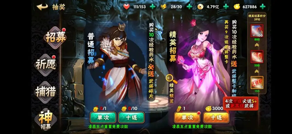 精英招募:想要获得更高等级(B-SSS级)的武将,就要在精英招募中购买高级经验药水啦!每招募10次必得到一个武将哦(注意:有机会直接招募到SSS武将)~精英招募积分也可直接领取SS武将一枚