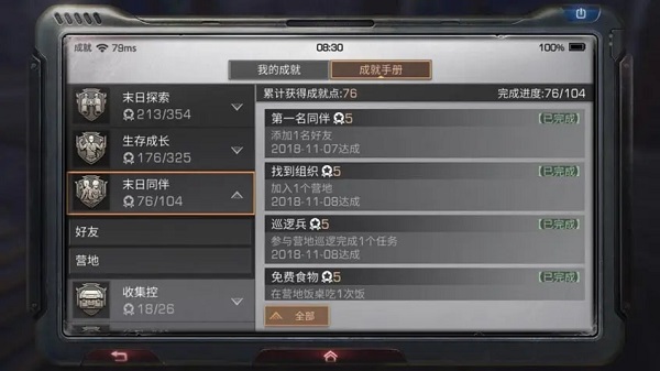 末日幸存者:就是你登录游戏的天数,分为1天、7天、30天、360天这四个档次,相信大家都已经到达30天这个档次啦,在这里可以获得23成就点。