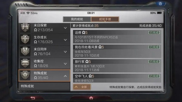 成就任务共分为末日探索、生存成长、末日同伴、收集控、特殊成就这几个板块构成,完成这些模块里面的任务,积累到一定成就点数可以获得奖励。