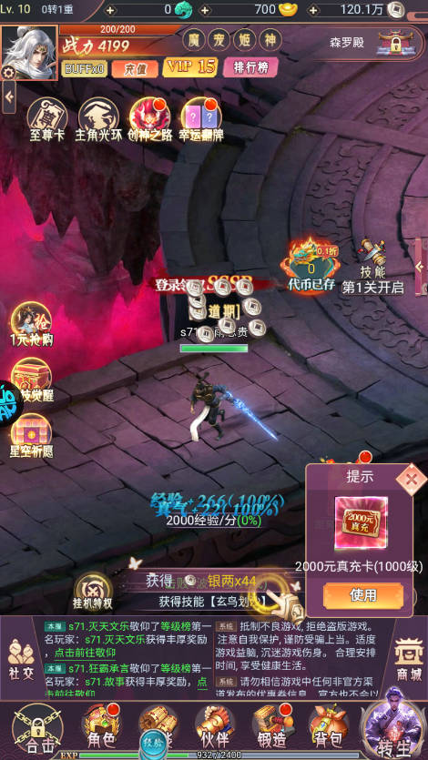 2、游戏一上线即可获得满级VIP15特权,畅享尊贵身份和全方位加成。