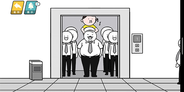 第六关上班乘电梯途中遇到了领导,操控人物往电梯里面挤给领导腾位置,上电梯后承认是你放的屁即可。