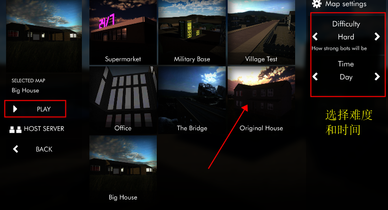 3、右上角选择游戏难度和游戏时间,中间选择一个地图,然后点击左边play开始游戏。
