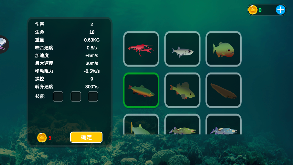-场景自选,选免费的螃蟹先来一局,攒到5个鱼币找鲨鱼(只要有攻击力的鱼都行)自杀,回到主页