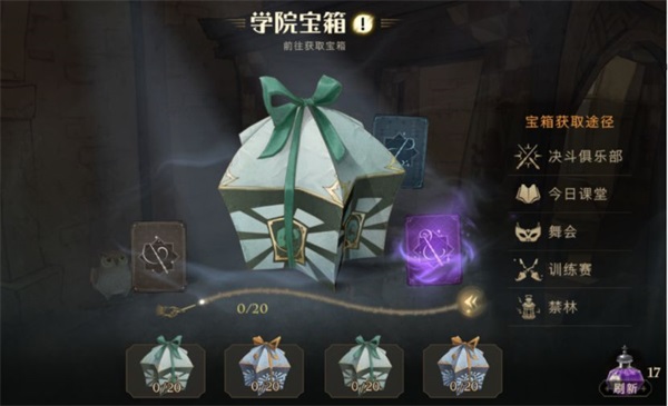 活跃度怎么来呢?点击宝箱会有提示:可以是决斗、上课、跳舞、训练、禁林都能获得活跃度,而是是无限制的,意思是如果你不喜欢PVP,你完全可以不断地跳舞拿满今天的宝箱。