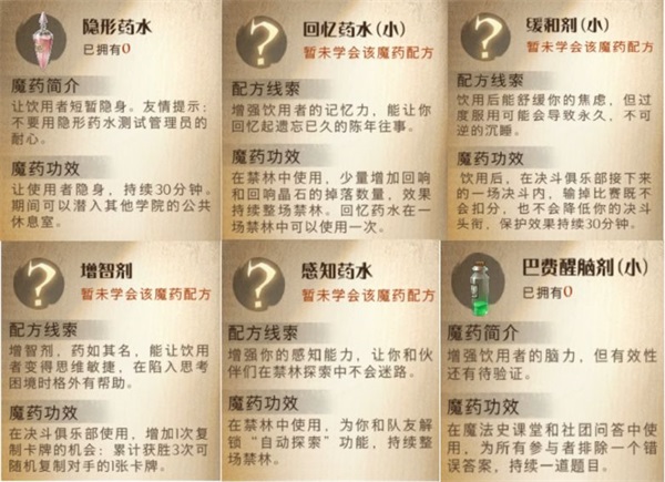 而且内侧很多人不重视魔药,魔药在PVE和PVP作用同样很大,我随便给大家截几张图感受一下效果(放几张功能性药剂,那些战场性的可以去寝室查看)