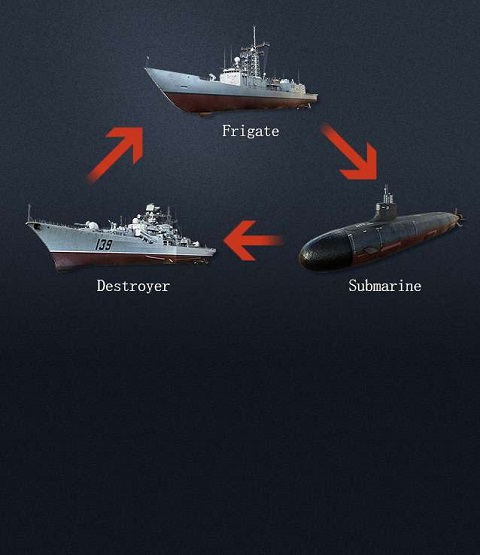 4、游戏提供了驱逐舰、护卫舰和潜艇三种基础舰艇类型,合理利用舰船的相互克制关系(驱逐舰克护卫舰、护卫舰克潜艇、潜艇克驱逐舰),可以在战斗中打出更高伤害。