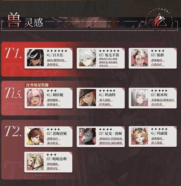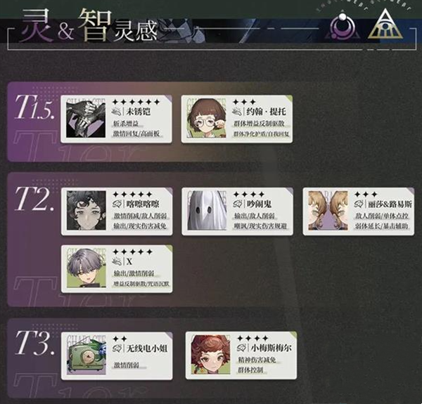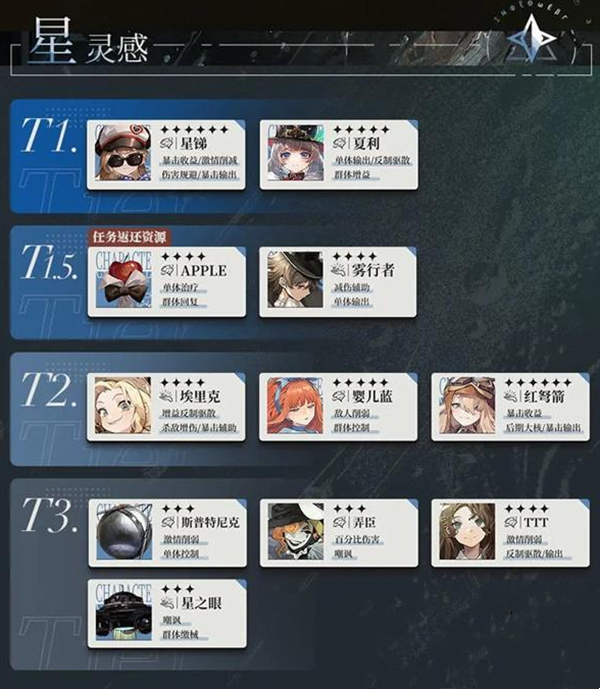 T1:星锑(暴击收益/伤害规避)、夏利(单体输出/反制驱散/群体增益)