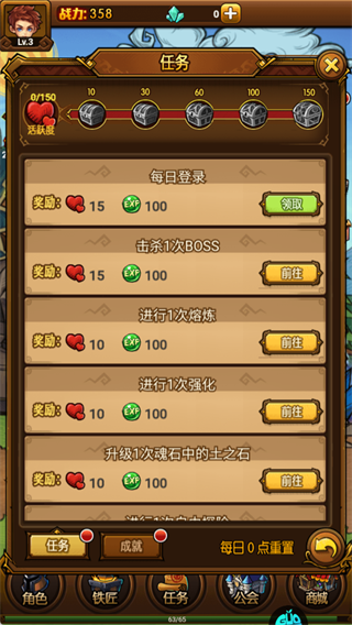 先领【每日登录】奖励,再通过击杀BOSS、熔炼等任务攒活跃度拿宝箱,快速提升等级和资源。