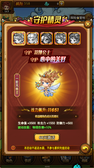 68元激活一阶风精灵,能直接加11651战力,还附带物理伤害+10%的被动。