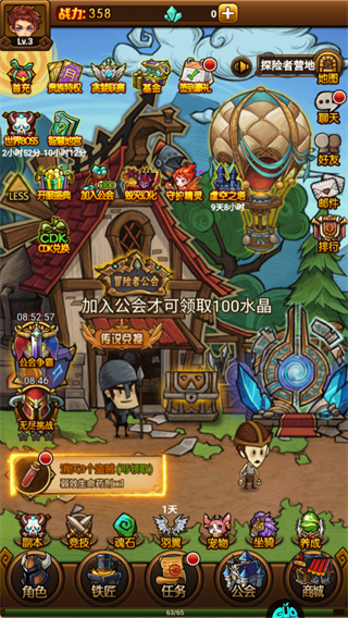 加入公会操作,可直接领取100水晶福利,还可参与公会争霸快速获得物资。