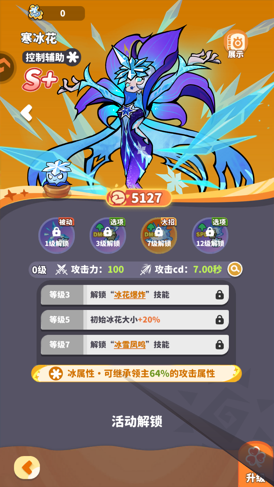 ①极塞冰花:发射旋转冰花,命中敌人造成伤害和冰冻。