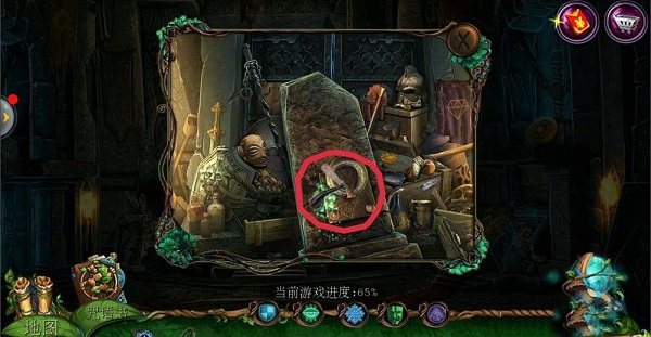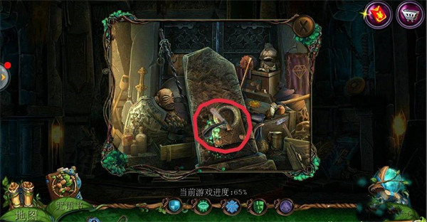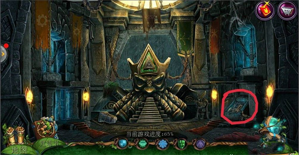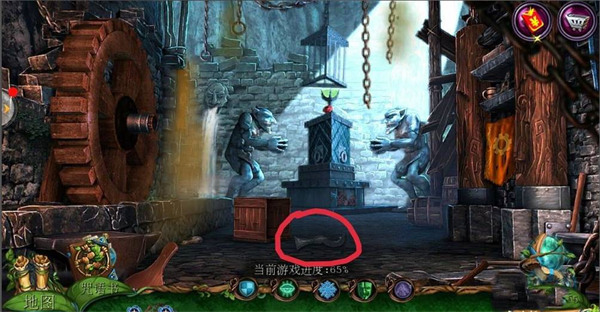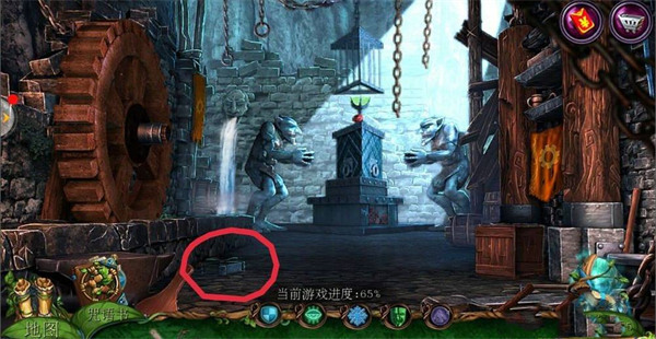 2、点击左边场景【哥布林房间】,点击中间下面的齿轮;在齿轮旁边拿到【铁链】;用【八边形钥匙】打开机关,在地上拿到【镰刀】。