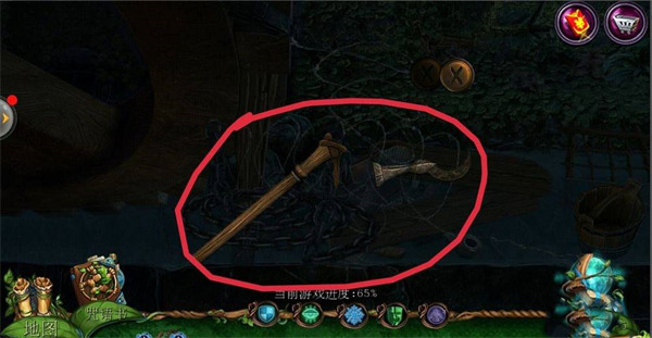 8、点击左边的齿轮,用【钳子】剪断铁丝;清理掉所有卡住轮子的废弃物;先找到【锯子】锯掉木棍;再找到【钩子】钩树叶里的【锥子】;把【锥子】放在石头堆里,最后用【锤子】敲打,移开石堆;完成游戏,拿到【起重器】。