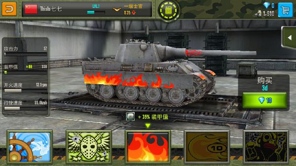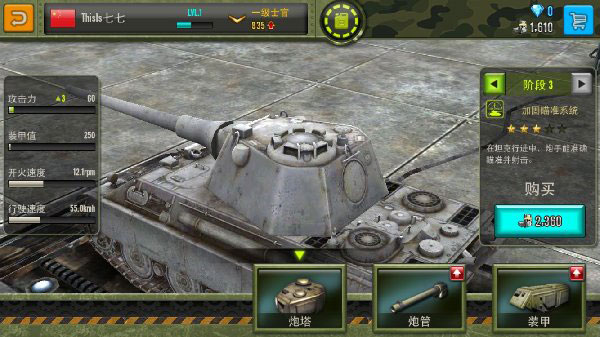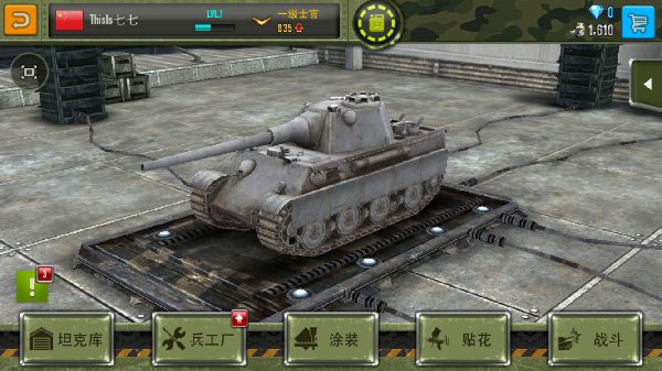 点击开始,进入游戏备战室,这里有坦克库(选择你要上场的所拥有的坦克),兵工厂(可以升级装甲、炮管、引擎等),涂装(坦克花纹,可以增加攻击力和开火速度)以及贴花(标志,可以增加攻击力和速度),其中涂装和花纹用钻石买,而且有时间使用限制,大概两天就消失。