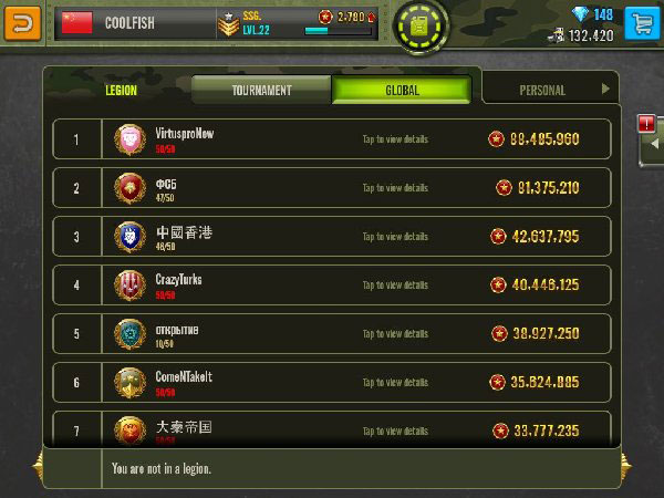 你永远不会孤军奋战,创建或加入一个军团来与志同道合的指挥官们一同竞逐每周的排行榜,并且一起获得奖励,雄霸疆场