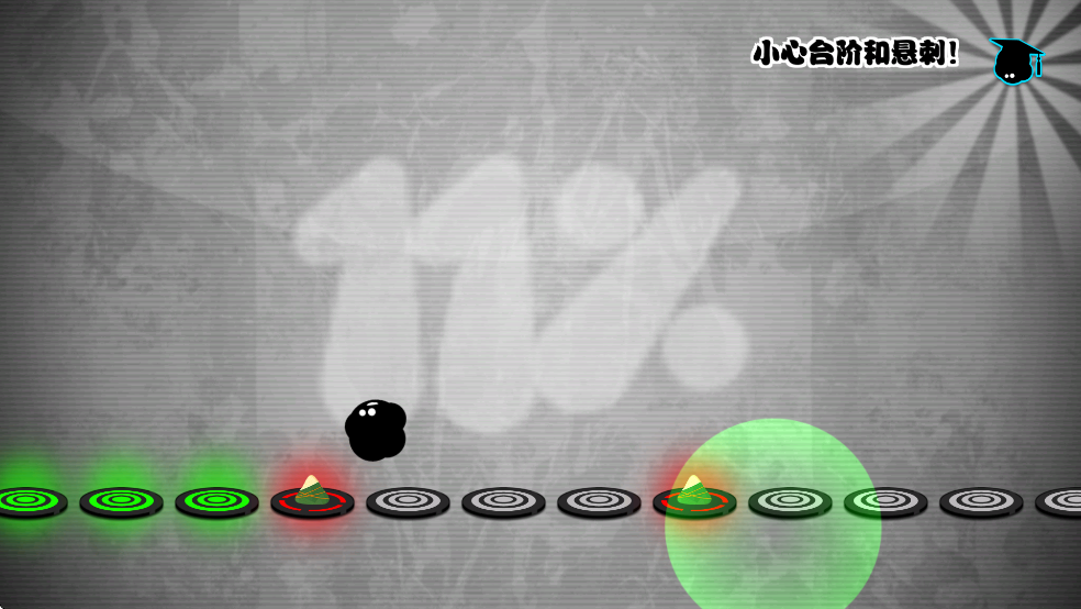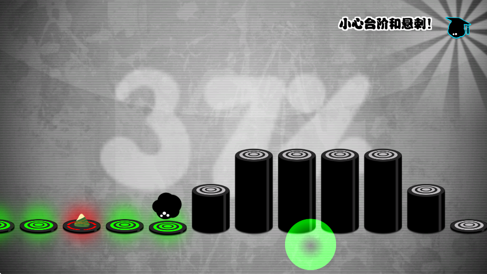 当然《永不言弃》高分只会跳跃还不够,因为闯关的过程中我们还将遇到各种陷阱由于小墨点会一个劲地前进,所以对于面前袭来的陷阱,我们需要机智地进行躲避,对于玩家的反应能力相当考验,容错率极低,只要在对应点位没有正好按下就会以失败告终。