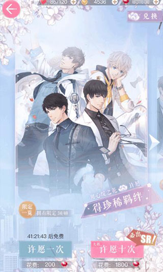 卡池分为两个,一个是钻石抽卡,可以获得珍稀羁绊,48小时可以免费抽卡一次,十连必出SR;另一个是金币抽卡,可以获得珍贵羁绊,24小时可以免费抽卡一次,有一定概率出珍稀羁绊碎片。点击【限定一览】可以查看可以抽到的羁绊,许愿抽卡所获得心绽之花和心绽之瓣,可以在右上角的【兑换】中兑换羁绊。