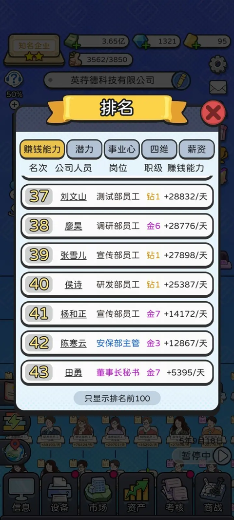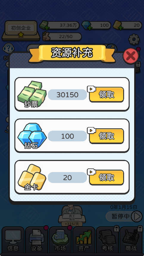 3、至于钻石资源,由于不频繁招聘、也不刻意刷员工属性,基本只需用来解锁“考核”与“市场”模块,让现有员工可以完全分配即可。由于总人数限制得当,这部分功能的解锁范围也无需过大,日常主要靠“商战”获得收益,偶尔关注即可。