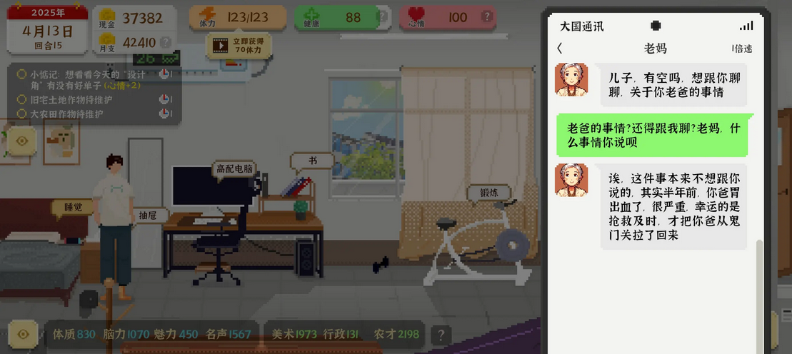 均衡发展啥也不用变,上班打卡帮同事跑腿,时不时巡视一下工作室,再犁下自家的承包地,健康低了锻炼一下还能顺便加体质,嗯,操作很多,赚钱速度马马虎虎吧。这是第65回合,主升的美术。