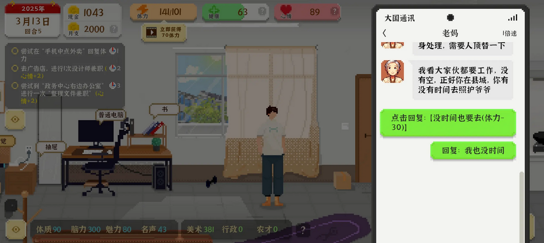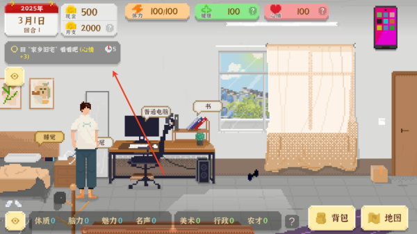 老哥借钱不要给。有概率不还,亏节奏。我这里运气好捡垃圾捡400,做的项目给2000,买完手表冰箱还剩了不少钱。如果发现自己到第七回合不能攒下手表1600+设计软件1500+租金1400,把垃圾全卖了,个人项目的钱也取出来,然后地图右边小卖部打工16体力110块钱【手表减20%】。
