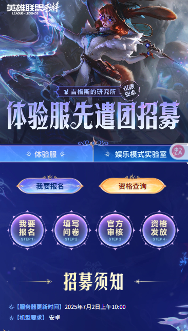 3、点击后进入LOL手游体验服申请界面,在这里点击【我要报名】选项,然后填写问卷提交,之后等待名单出来之后点击“资格查询”即可。