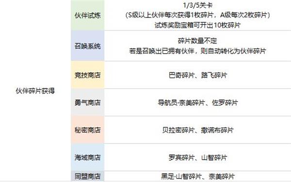 伙伴碎片获取方式很多,上述表格中罗列了一些获得方式。