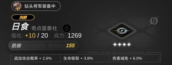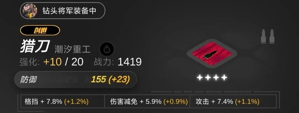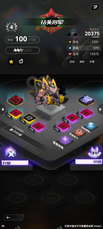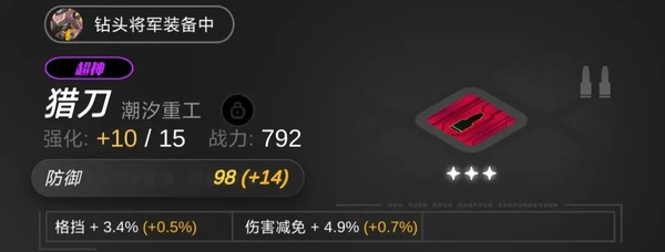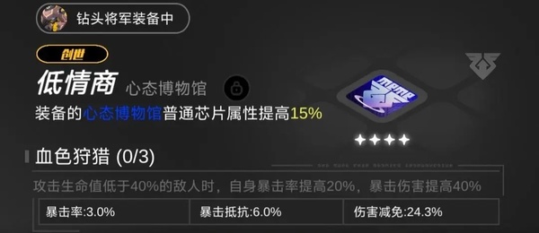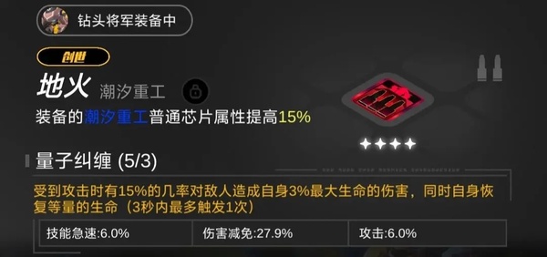 4、钻头将军——坦,主堆防御,芯片副词条建议减伤(这是看论坛了解到的)生命的话有皮皮,不需要太多,我这只没星级是因为之前抽到的卡全分解换芯片,结果没刷到红,黄星也用完了