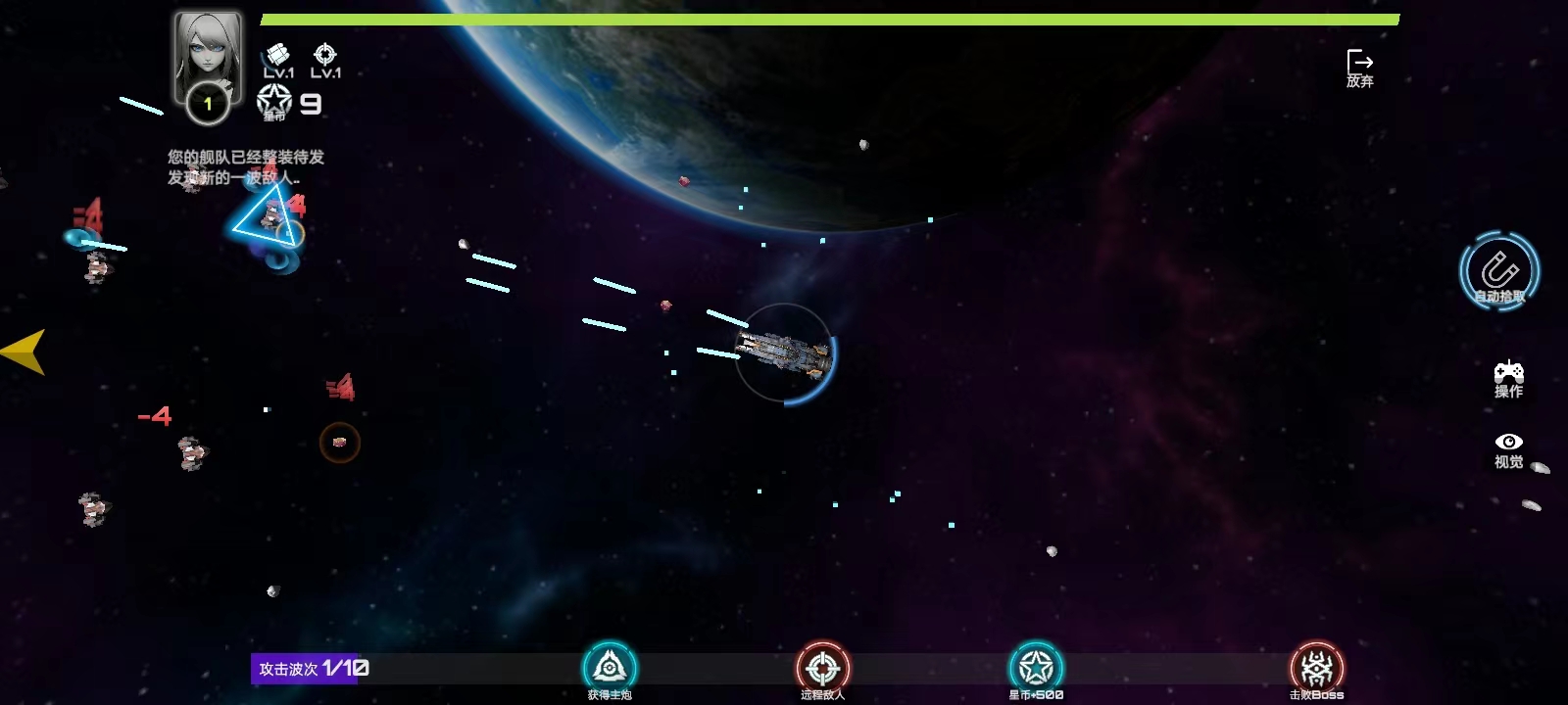 3、一共有十波敌人,玩家全部击败之后,即可成功;进入游戏后,战舰会自动识别敌军进行射击;