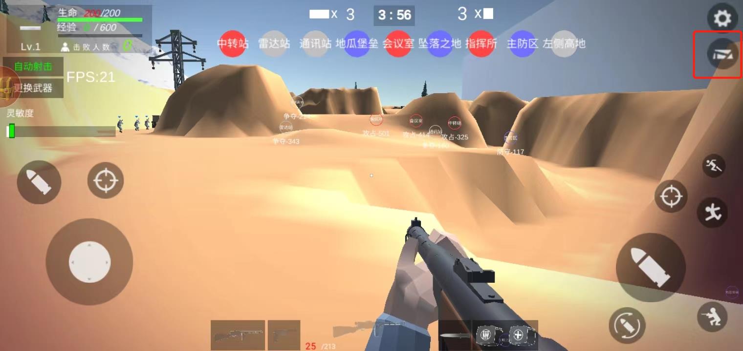 抗日战争模拟器是一款以抗日战争为背景的3D枪战射击类手游,玩家将会作为一名士兵参与到两股势力对抗的战斗之中,分为红队和蓝队,玩家可以合理搭配不同的兵种与武器,并根据自己的战术灵活搭配。游戏内一共有中转站、雷达站、通讯站、地瓜堡垒、会议室、坠落之地、指挥所、主防区、左侧高地等地区,玩家可以根据地图来确定自己的位置,快速与队友汇合。抗日战争模拟器游戏玩法十分刺激,心动的朋友欢迎下载游玩!
