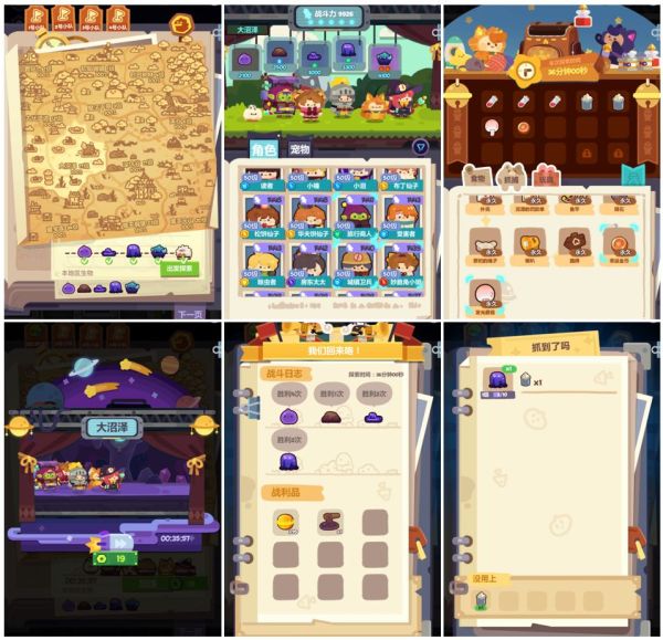 1、点击路牌出发,冒险家们放置角色、宠物,带着食物、抓捕、玩具探索,获得金币和资其他资源,随着探索区域的逐渐解锁,会出现挑战小怪的环节,这时候就需要冒险家们带领大家勇敢战斗了!