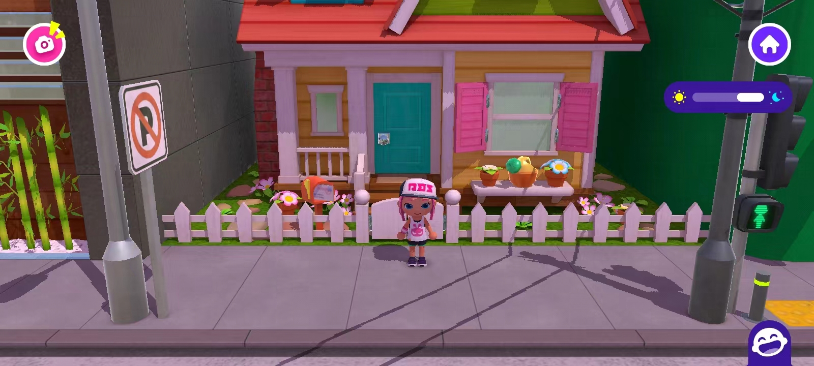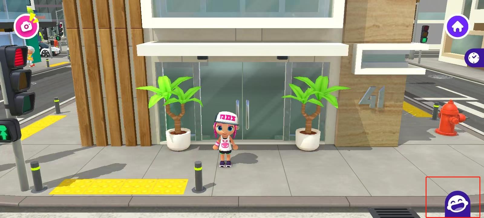 5、点一下身后的大门,可以切换另一个场景;进入场景后,里面是家居生活场景,你可以在这里点击你的卡通人物在这里玩耍,做饭等等,还能左右滑动屏幕;点击下方的透明白色按钮可以回到之前的场景;