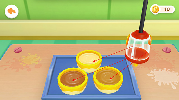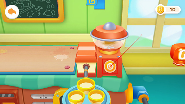 搅拌完毕后,用户只需点击屏幕中间的开关图标,就可以取出已经搅拌均匀的冰淇淋;游戏中一共有三个碗,用户可以自由选择将冰淇淋倒入哪个碗中;