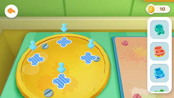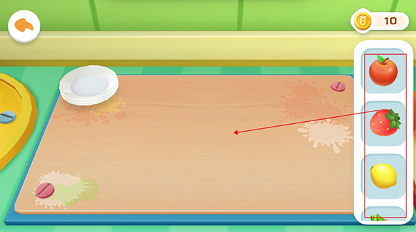 在制作雪糕的过程中,我们还可以加入一些新鲜的水果;用户可以在游戏的左侧选择三种宝宝最喜欢的水果,然后用手指滑动屏幕,将水果切成小块放入盘中;