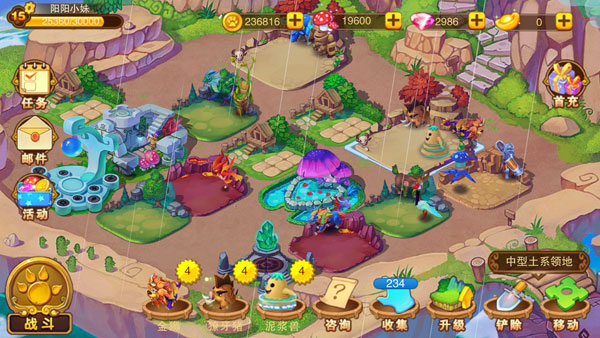 玩家可通过收集操作,获得神兽在领地中产出的金币。当领地内产出的金币达到一定数量时,在领地上直接显示“金币”标识。此时,点击领地即可完成收集金币