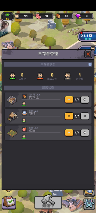 在【幸存者管理】界面中,我们需要合理分配人员工作,快速安排工作人员到各个岗位,让每位幸存者都能发挥最大作用,提升营地整体效率。