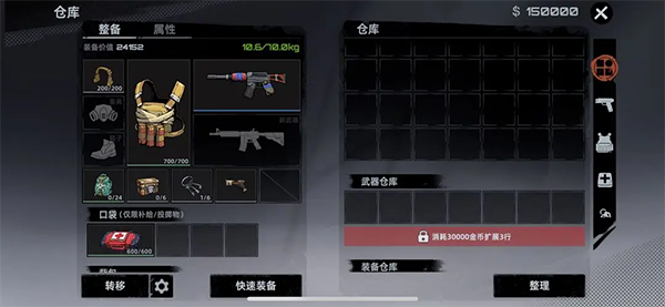 在仓库界面,您可以查看您所有的物资,装备以及战利品。