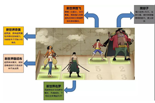 第二套阵容也是同样推荐给白胡子让出一个位置来让他当前排,这里推荐白胡子主要有两个原因:第一是关键性原因,白胡子有断技能力,虽然拿满怒的新世界奈美没办法,但是对于其他人还是起到关键性作用。新世界路飞上场后,拥有着可以媲美狮子歌歌的输出能力,正好新世界路飞的攻击方式为前排优先,索性把白胡子放到前排断新世界路飞的技能,让他放不出AOE,无法完成收割,这对战场的局势大有助益。第二个原因,白胡子震动之果天赋能让对方全体成员在两回合内命中和闪避降低,配合黑胡子,能够最大化降低对方的命中闪避,也同样具有战略作用。